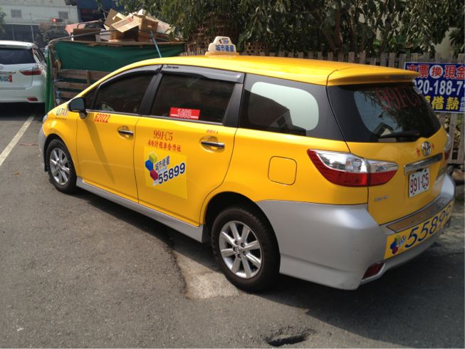 タクシー。大きなカバンも運べます。人も沢山乗れるし、日本のタクシーも こんな感じを採用すればいいのにな〜って思いました。